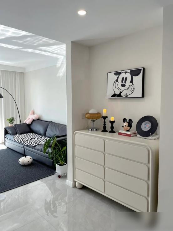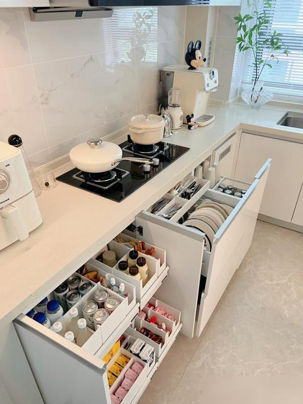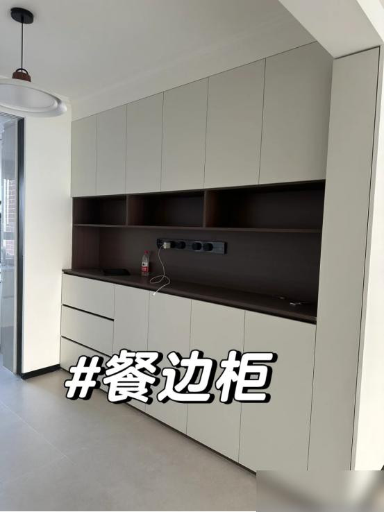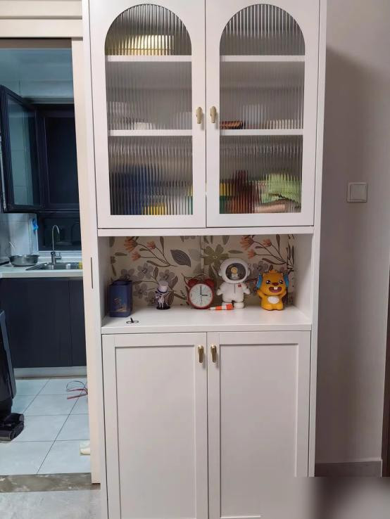 还有“藏二露八”这事儿,我算看透了:全开放柜就是“看着香用着愁”。我闺蜜家整了一整面玻璃开放柜,当初拍照片贼高级,结果现在她天天吐槽“擦玻璃擦到手指疼”——杯具上的指纹、摆件上的浮尘,每天得擦半小时。我家就聪明,80%封闭柜藏杂物(比如孩子的玩具、我爸的工具),20%开放格放常用的杯子、香薰,既好看又不用天天打扫——你说,这不是“鱼和熊掌都兼得”吗?