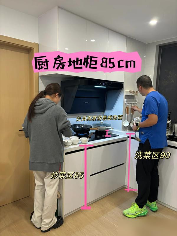 现在自己家做了高低台:炒菜区85cm(刚好抬胳膊不费劲),切菜区75cm(弯腰不累),上次我妈来做饭,说“你这台面比我单位食堂的还合理”——厨房又不是某个人的专属,得按常做饭的人的身高来,不然天天弯腰驼背,谁受得了?