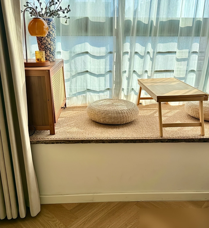 我家次卧的飘窗没砸,铺了块地毯,放了个小茶桌,周末窝在那喝喝茶、看剧,偶尔客人来了铺个床垫当备用床,这不比榻榻米实用一百倍?